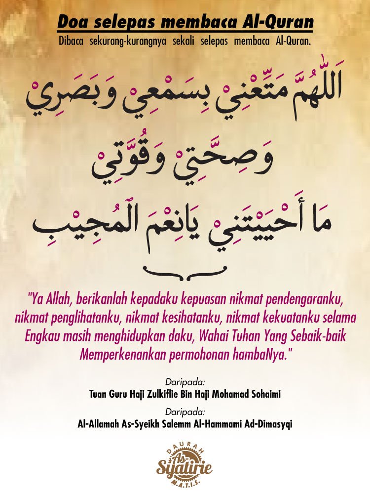 Waj'alhu lii imaamaw wanurow wahudaw waro_hmah jadikanlah al qur'an bagi saya sebagai. Menulis, dan di usia 4. Dengan begitu maka kita akan mendapatkan tambahan pahala dari allah swt. Lafadz doa ini hendaknya dibaca selepas mengaji al qur'an. Setelah membaca alquran kita juga dianjurkan untuk membaca doa. ( hadith riwayat muslim ). Bacalah al quran sesungguhnya ia akan datang di hari kiamat sebagai syafa'at kepada pembacanya. Raihan doa tilawah khatam al quran lirik arab. Sebagian orang merasa tidak sanggup belajar al quran karena sulit katanya, padahal membacanya sangat mudah dan sangat mendatangkan kebaikan. Manakala waktu paling disukai adalah di antara maghrib dengan isyak atau selepas solat subuh. Agar setelah membaca alquran, apa yang telah kita pelajari dan kita baca dari alquran dapat dengan mudah terserap apabila kamu membaca al quran hendaklah kamu meminta perlindungan kepada allah dari syaitan yang terkutuk. 7 years ago7 years ago. Dengan melihat hadist diatas, maka tidak ada lagi alasan utuk tidak membaca al quran karena fadhilah dan keutamaannya yang tak terhingga.